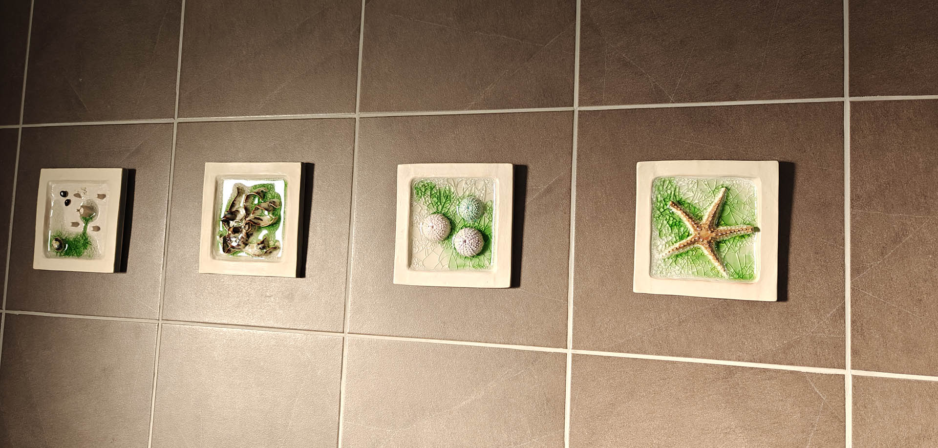 Wall art grouping; Beige tiles